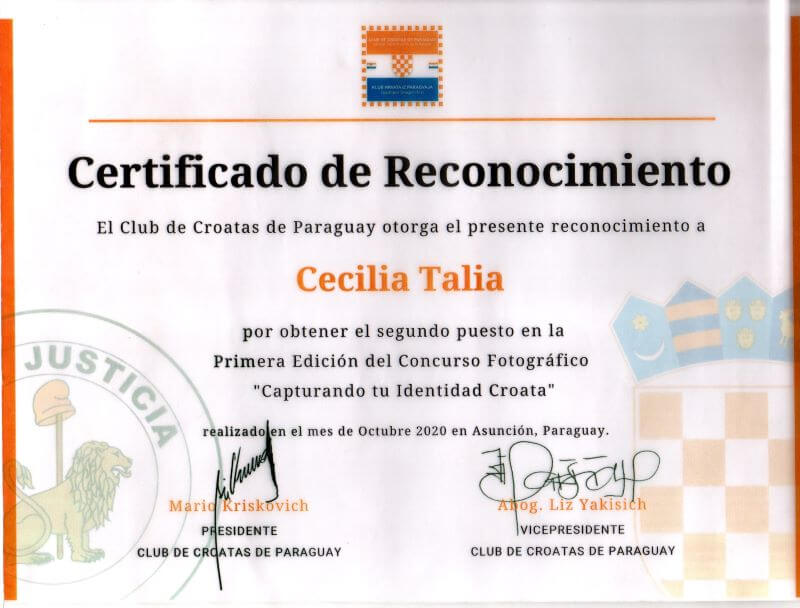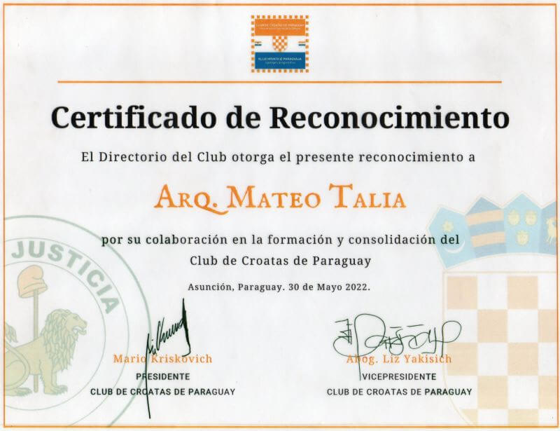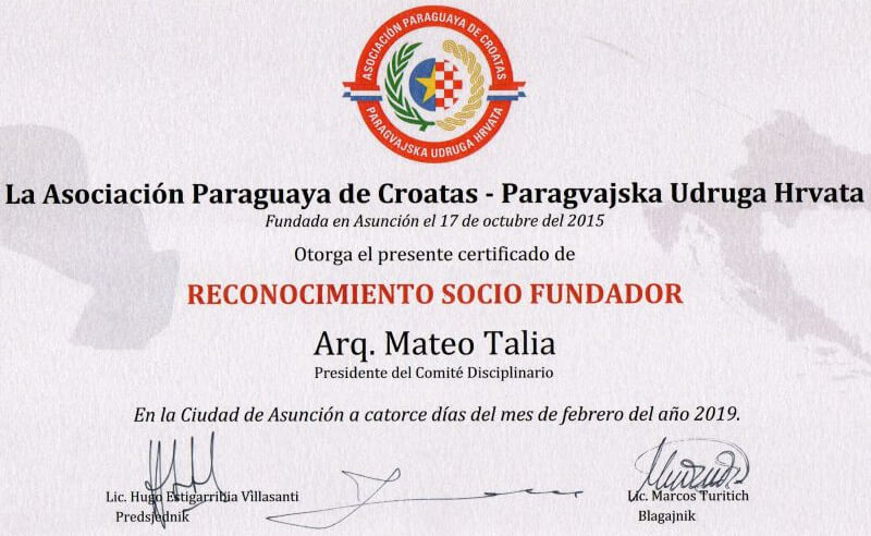 On October 24, 2019, my daughter, lawyer María Cecilia Talia Moreno, was elected to hold the position of secretary of the Ethics Council of the CLUB DE CROATAS DE PARAGUAY, whose slogan is: “United by the force of blood”.
