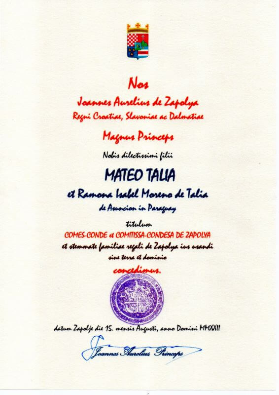 On August 15, 2022, together with my family, I received the honorary title of Count of Zapolya, a distinction that commits us even more to continue promoting union and brotherhood among the Croatian descendants of Paraguay.