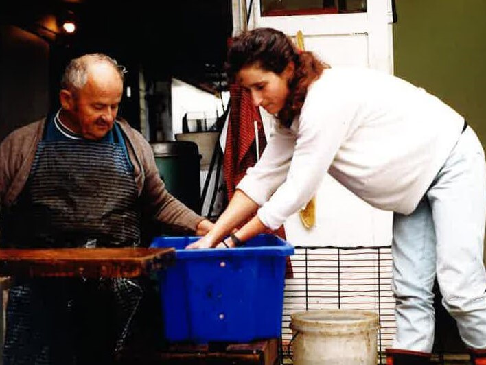 Venessa con su padre en 1992 preparadno pescado ahumado. Ahora ella es presidenta de Club cultural Dalmata en Dargaville y trabaja como planificador de gestión de recursos.