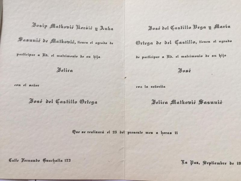Jelica Matković se rodila u Splitu 27. svibnja 1924. godine. Roditelji su joj bili Josip i Anka Sasunić, oboje iz Vrboske na Hvaru. Obitelj je prije njenog rođenja živjela u Celju u Sloveniji gdje se rodilo troje djece: Nikomir, Ljubenko i Cveta. Zatim su došli u Split odakle su zbog ekonomskih razloga odselili u Boliviju. Tamo su već živjela dva Ankina brata, jedan u Cochabambi, a drugi u Oruru. Prvi je u Boliviju otišao Josip s kćerima, a Anka je sa sinovima ostala u Splitu. Po dolasku u Boliviju otac i Cveta su otišli u La Paz gdje je on otvorio trgovinu prehrambenih namirnica. Jelica je otišla u Cochabambu k rođacima iz obitelji Štambuk/Sasunić. Prošlo je par godina dok je majka došla iz Splita u La Paz sa sinovima. Tada se obitelj ponovo okupila, a pridružila im se i Jelica. U La Pazu je počela ići u Englesku katoličku školu i raditi u očevoj trgovini. Kada joj je bilo 18 godina, Jelica je upoznala mladića imena Jose del Castillo. Vjenčali su se 25. rujna 1948. godine nakon sedam godina veze.