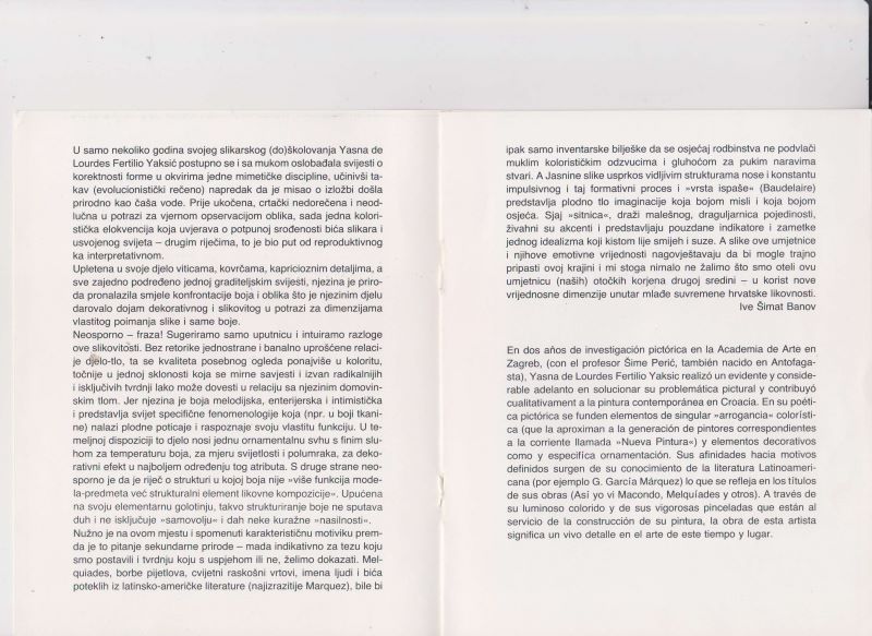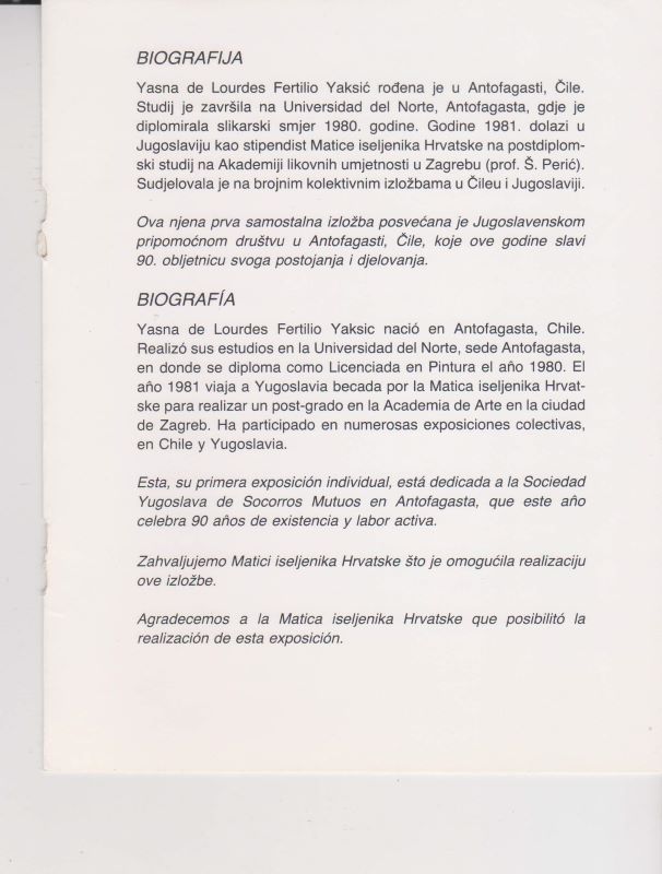 Yasna Fertilio predstavlja mladu i vrijednu nadu likovne scene Antofagaste, diplomiravši na znamenitom Odsjeku za vizualne umjetnosti Sveučilišta Sjevera, i to u razdoblju kulturne tame (sedamdesetih i osamdesetih godina). Njezin prolazak kroz ateljee bio je tih, nenametljiv, uvijek usmjeren na duboko usvajanje praktičnih i teorijskih disciplina koje je pretvarala u vlastiti izraz. Njezina šutnja bila je zapravo priprema za postupnu eksploziju stvaralaštva, kojoj danas imamo čast svjedočiti: svojevrsno proljeće puno boja, u kojem koloristično bogatstvo nadilazi puku osjetilnu ugodu.