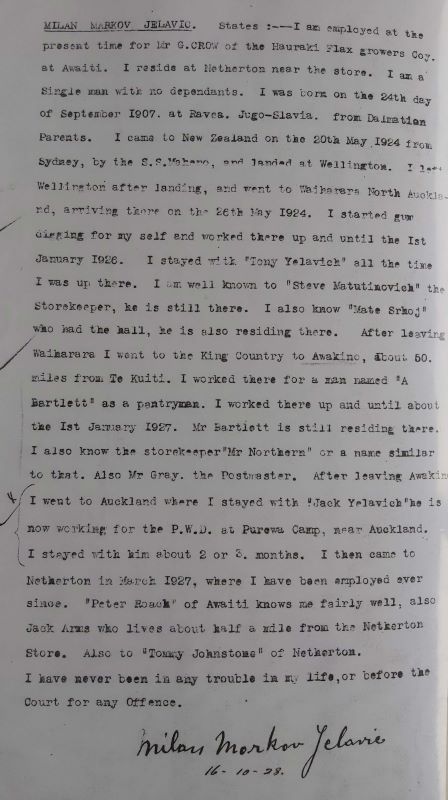 Prvi Dalmatinci stigli su na Novi Zeland oko 1860. kako bi radili u poljima smole na sjeveru države. Bili su uglavnom s područja Vrgorca i Ravče, prezimena Rakić, Triln, Yelavić, Vela, Vega i Selak.